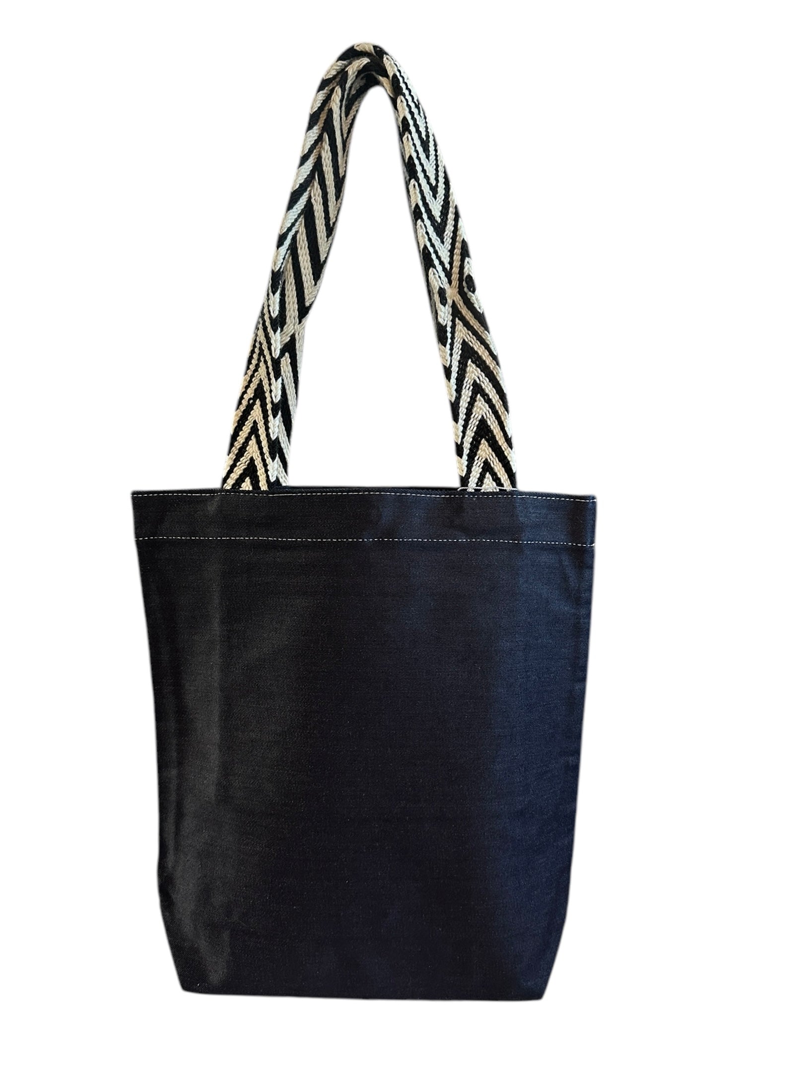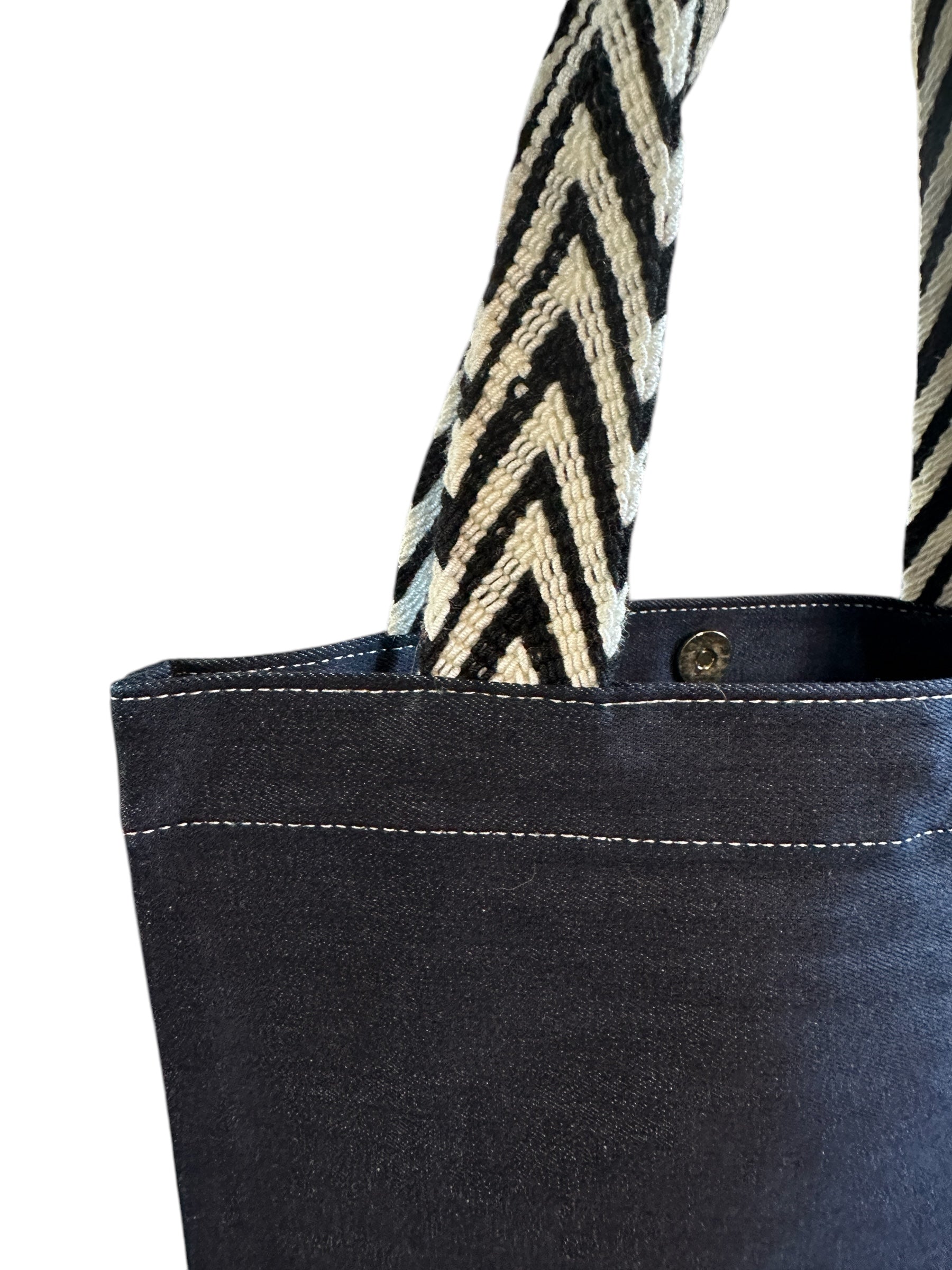 The Market tote is made from curated fabrics and artisan details. Shoulder strap webbing is made by the Wayuu tribe from Colombia. Each handbag is limited edition. This easy tote has an interior open pocket and magnetic snap closure. This tote has a beautiful silver interior coating on the inside of the denim. It is the perfect tote to carry to the farmers market or carry your laptop!